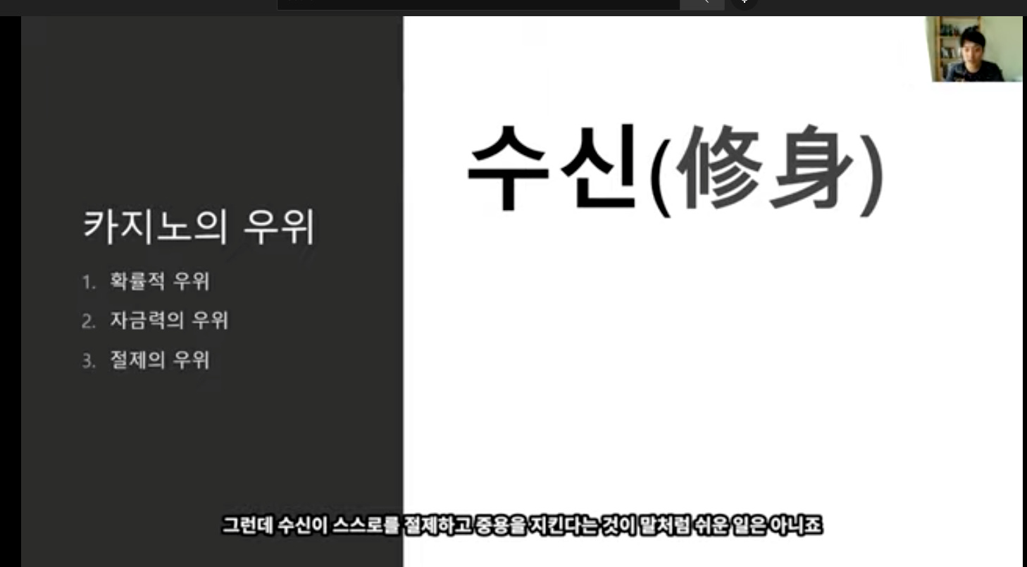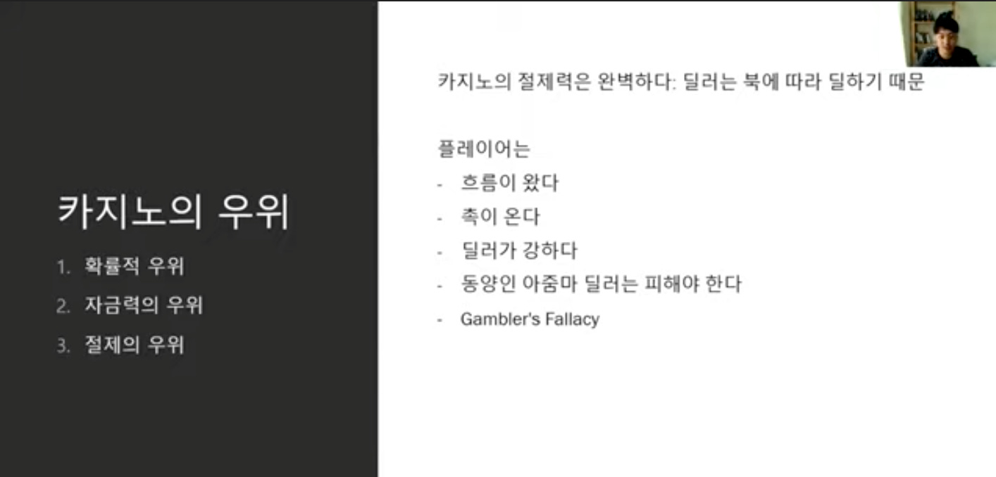 - 절제의 우위: 카지노의 절제력은 완벽하다. 딜러는 북에 따라 딜하기 때문에 (하우스는 교과서적 플레이만 한다. 그런데 플레이어들은 '촉'을 믿고 확률적 우위를 거스른다.)