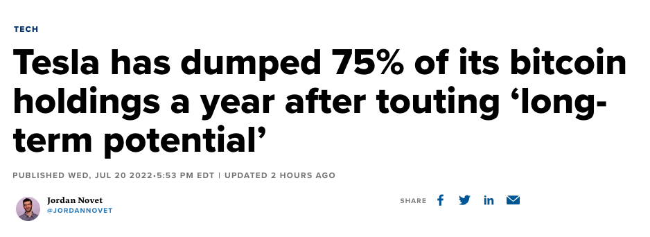 테슬라가 2022년 2분기 보유 비트코인의 75% 가량을 매도했다고 합니다.