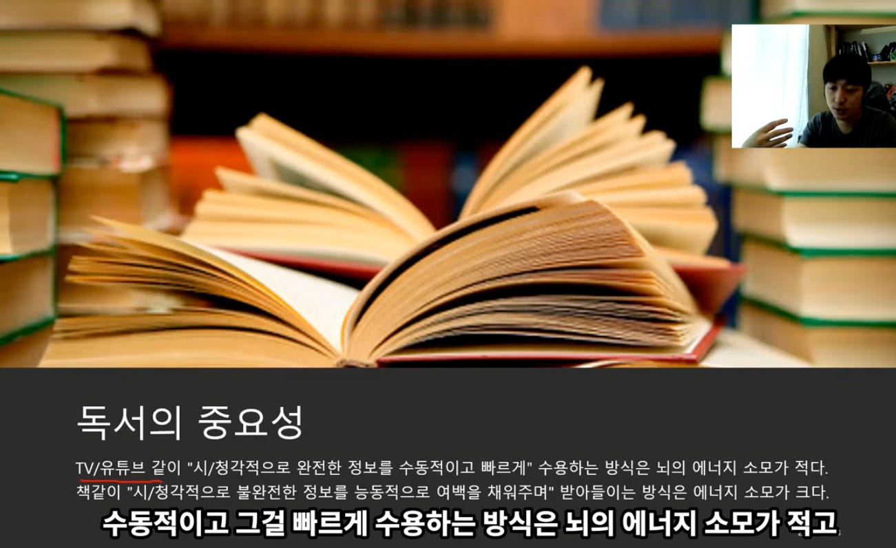 책은 능동적으로 읽어야 하므로 에너지 소비가 많다...그러니 책을 읽으면 지루하다고 함