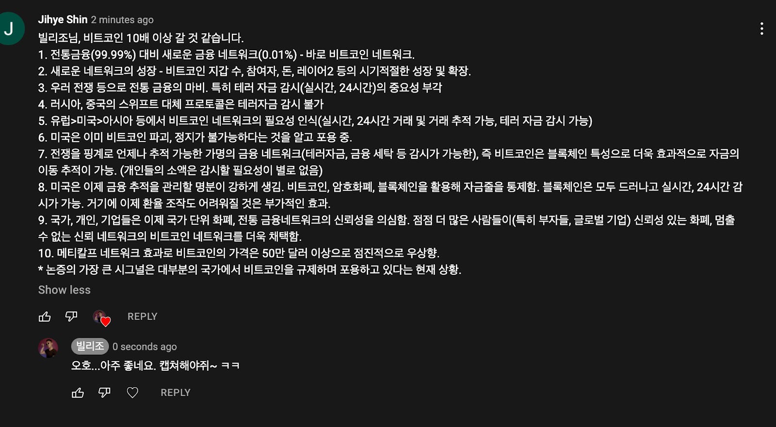 오작가님 영상을 처음부터 계속 시청해왔습니다. 보면서 느끼는데 영상은 길지만 그 밑에는 일관성이 있네요. 1. "지정학적 위기땜에 비트코인은 더욱 중요해질 것이다." 2. 경제학은 지정학적 리스크를 포함하지 않은 온실속의 화초 (즉 이상과 현실의 괴리가 심하고 가면 갈 수 록 심해질 것이다) 3. 미국이 강대국인 것은 사실이나 우리가 알던 만큼 슈퍼맨 미국은 사라지고 있다 (현재 미국거주 중이므로 이것에 반박할 여지가 없습니다 저로서는) 오늘도 감사합니다. 폴보커 책 샀는데 안읽고 먼지만 수북했는데 읽어보겠습니다.