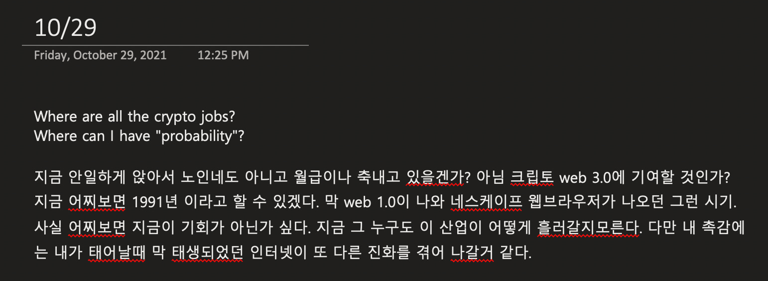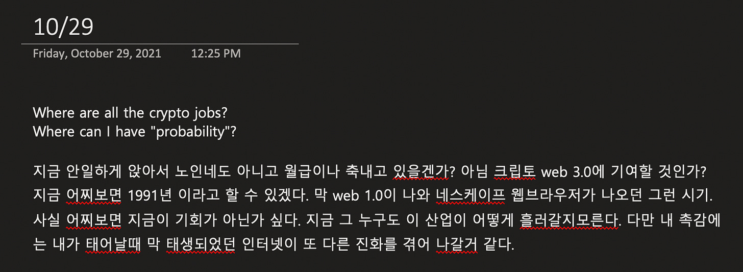 제 나이 이제 만 20대 중후반이 되는 이 시점에서, 웹3.0이 등장하는것은 내게 큰 행운이라 생각드네요.
