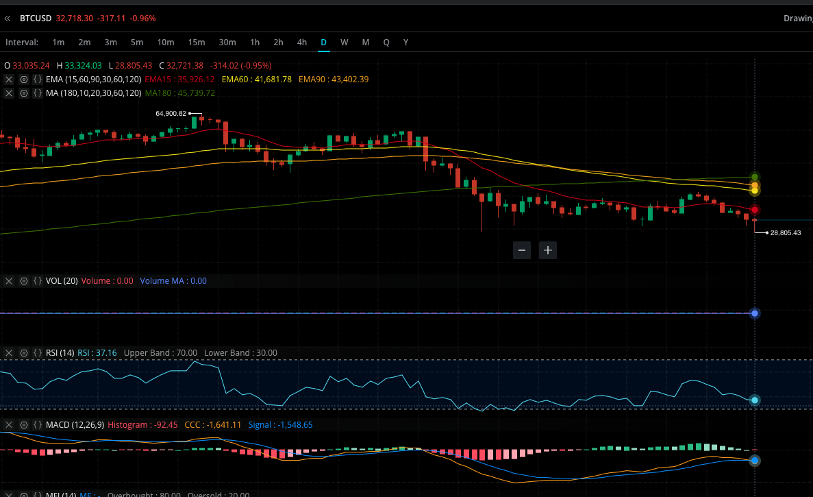 보시다시피 우리는 $28.8k에 미국 태평양 표준시로 혹독한 아침을 보냈고 지금은 $32,000입니다. 녹색 선은 180일 이동평균을 나타냅니다. 저는 보통 이렇게 차트를 보는게 잘 작동하고 있었기 때문에 그린 라인 (180일 이평선) 에 도달했을 때 주식이나 암호자산을 구입합니다. 그리고 180일 이동평균에 도달 한 후 볼 수 있듯이 그다지 더 떨어지지 않고 가격 변동이 거의 없습니다. 또한 사람들이 비트 코인을 과매수 또는 과매도 하는지를 나타내는 RSI를 확인합니다. 40 이하에서는 구매하는 것이 좋습니다.
