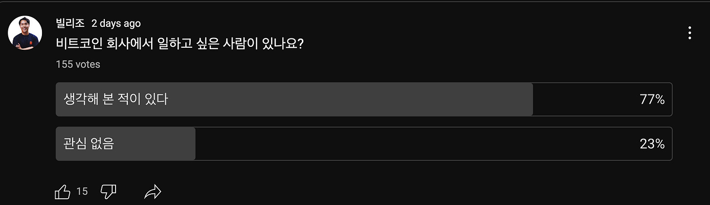 이렇게 200여 분에 가까운 분들이 비트코인 회사에서 일해볼 생각을 해보셨다고 해서 더 심도 있는 설문 조사를 준비해 보았습니다.